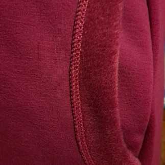 The curved pocket openings have a facing, so for this version I made it so it shows on the right side. The raglan seams sewn WS togther so the seam allwances show on the RS and the hood seams and edge also have the fluffy side turning out to the RS.